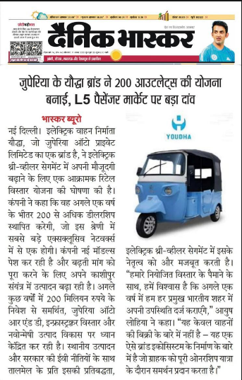 Brand Center Download Brand Logo Download Product Specifications Launch/Events The countdown begins - launching July 17! अब पीछे हटना भी Safe है with Smart Technology Compact Auto. Big Impact. Launching Soon. The Youdha Electric L5 Auto is ready to change the game. Aapka Naya Saathi is Almost Here! Aapka Naya Saathi launching soon! Media / PR View Lohia | Youdha has partnered with Perpetuity Capital to make EV ownership easier than ever across Bihar and Jharkhand! View Lohia | Youdha has partnered with Perpetuity Capital to make EV ownership easier than ever across Bihar and Jharkhand! View Lohia | Youdha has partnered with Perpetuity Capital to make EV ownership easier than ever across Bihar and Jharkhand! View We are honored to receive the "Most Customer Trusted Brand of the Year" award at the 2W, 3W & EV Forum (TWF) presented by Trak N Tell. View Lohia Auto Transforms into Zuperia Auto Pvt Ltd (ZAPL), A Bold Step in Mobility Innovation View Budget 2025 : Auto industry eyes policy boost in 2025, here's what companies expect. View What are your expectations from the upcoming Union Budget 2025? - The Statesman View Govt policy towards battery swapping infrastructure to give biggest push to EV segment - The Statesman View Lohia Auto launches EV brand 'Youdha', aims to sell 3 lakh vehicles by 2027 View Lohia Auto Launches Youdha EV Brand With L5 Electric 3-Wheelers View Lohia Auto introduces its Youdha EV Brand View Lohia Auto targets 300k sales by 2027 with new E3W brand 'Youdha' View Lohia Auto launches EV brand 'Youdha', aims to sell 3 lakh vehicles by 2027 View Lohia Auto Launches ‘Youdha’ EV Brand, Targets 300,000 Units by 2027 View Lohia Auto Unveils Youdha, Aims to Revolutionize Electric 3W Market View ‘Youdha’ – A Brand Dedicated to India’s Real Warriors Launched